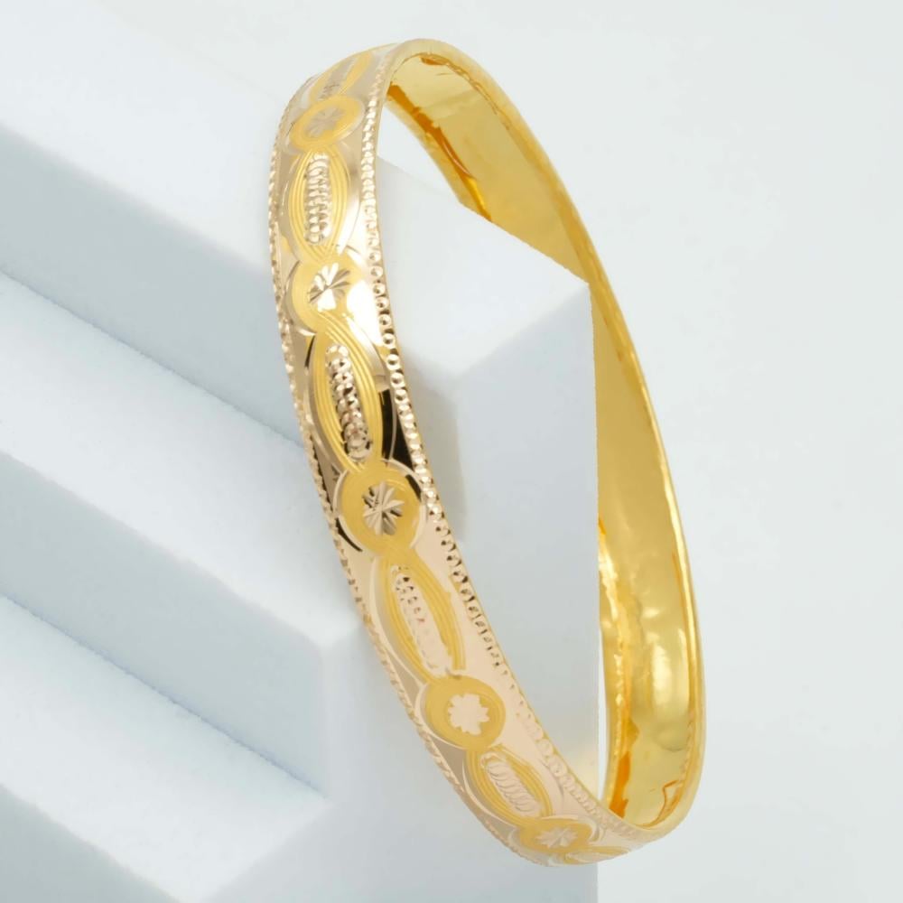 غوايش ذهب عريضة بتصميم أنيق ونقوشه محفورة بدقة عالية، وتبرز التفاصيل بطريقة فنية ملفتة، ومزيج النقوش المتداخلة تمنحها أسلوب استثنائي، وملفت للأنظار؛ لتكون إضافة أنيقة تليق بذوقك الرفيع. ✨