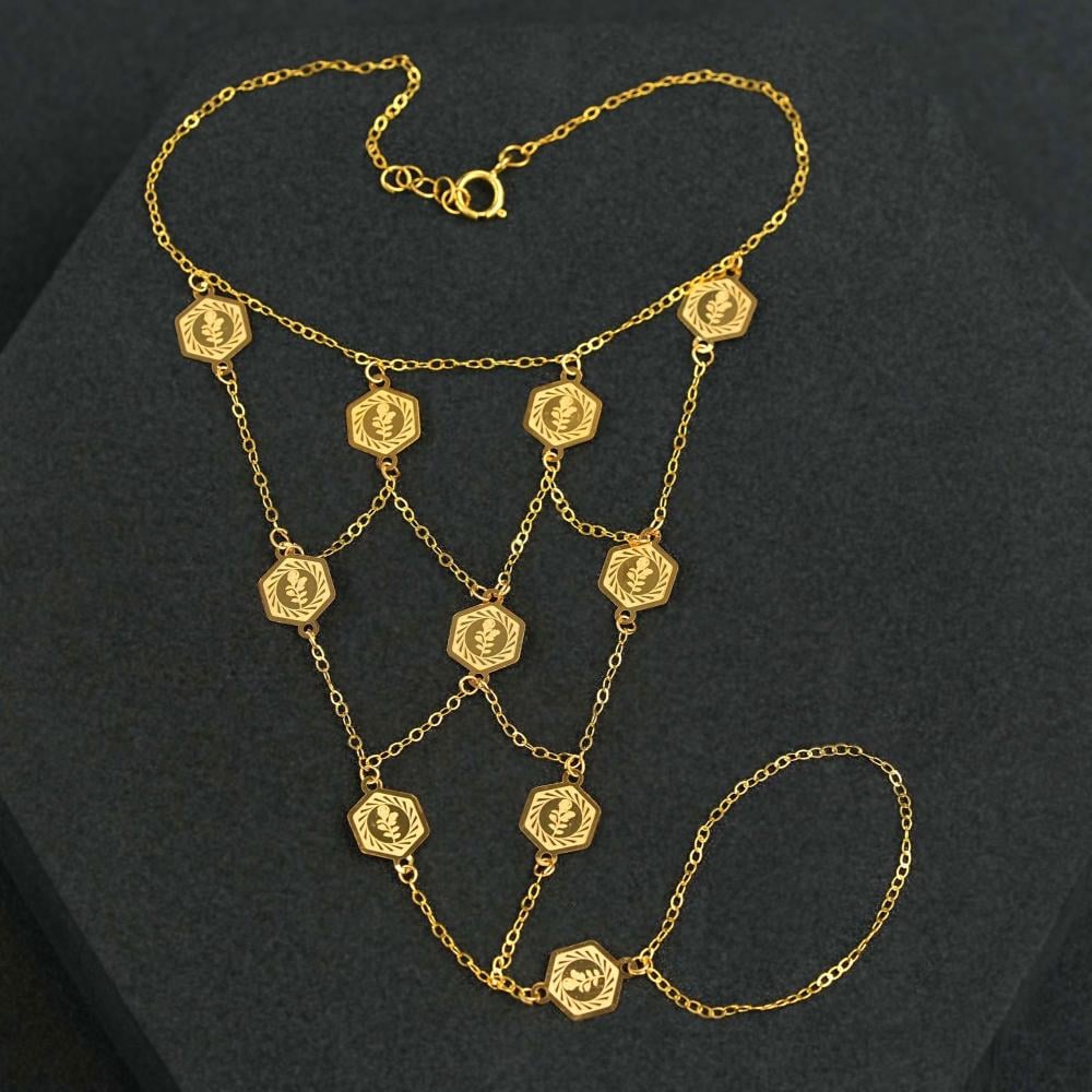 🔹 يتميز هذا الكف بشبكة ذهبية متداخلة مستوحاة من الفنون الشرقية الكلاسيكية، حيث تتصل السلاسل الناعمة بأشكال سداسية من الذهب، مما يمنحها لمسة من الأناقة العصرية مع الطابع الكلاسيكي الفاخر.