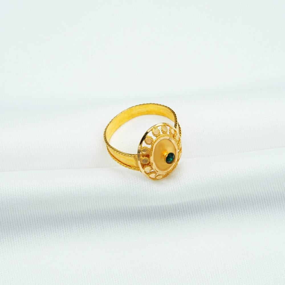 تفاصيل الخاتم غير عادية، شكلين بيضاويين يتداخلان وعلى السور الخارجي للشكل الداخلي تتحاوط النقوش الدائرية المميزة، لتضع داخلها جمال، وتألق لا مثيل له، محصور بجاذبية لافتة وفي المنتصف حجر لامع باللون الأخضر الغامق الذي يتماهي مع الذهب بشكل مميز.