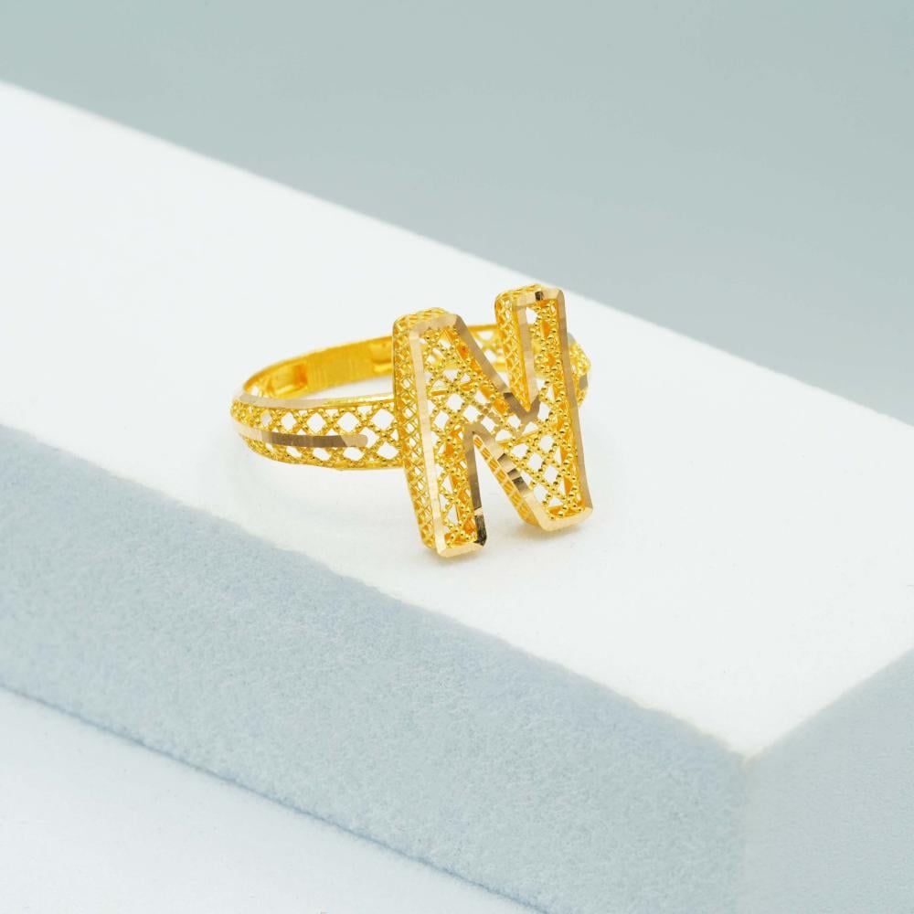 خاتم ذهب نسائي عيار 21 بحرف اسمك n، لامع وأنيق لإنه مصنوع من الذهب الخالص، كل تفاصيله متألقة، بتفاصيل دقيقة متشابكة تمنح الحرف عمقًا يليق بالتميز، وبريقًا يعكس حضورك أينما كنتِ.