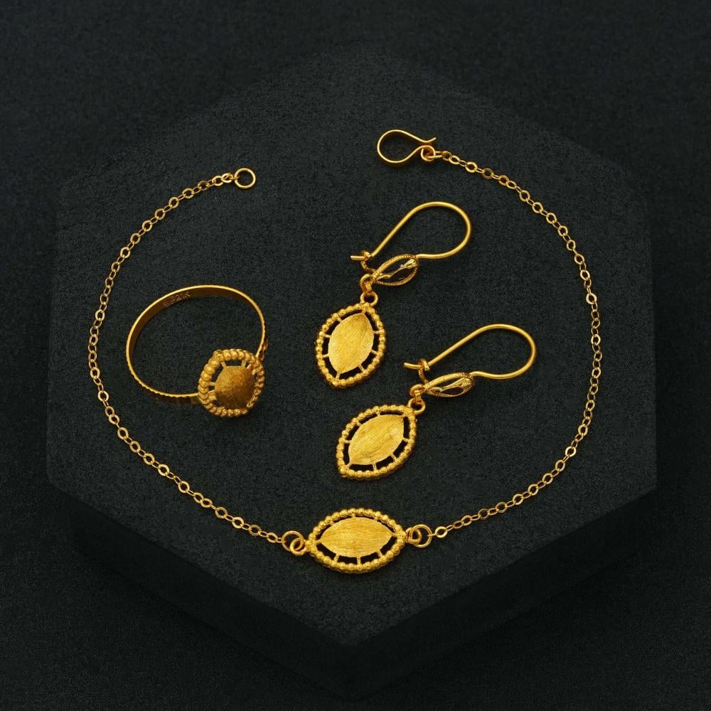 طقم ذهب عيار 21، بشكل مميز وأنيق، وغير عادي، كل تفاصيلها توحي بالفخامة، وجمال الطقم يلفت الأنظار نحوك بجاذبية لا مثيل لها، ويخبر الجميع بأنك الأجمل دومًا بإختياراتك.