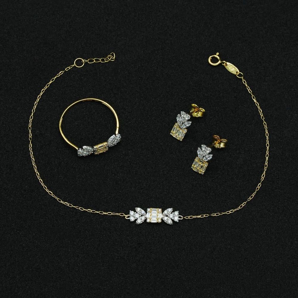 طقم مجوهرات ذهب، زخرفته مميزة عبارة عن دوائر مزركشة بشكل أنيق، مع التناغم الساحر بين كل أجزاء الطقم "السلسال، والحلق، والسوارة، والخاتم".