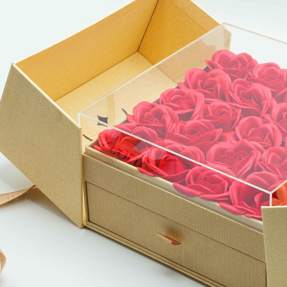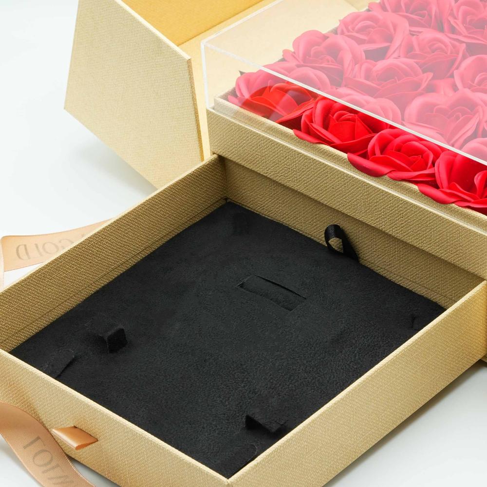 صندوق إهداء مخصص لطقم الذهب متين للغاية، وبه الكثير من التفاصيل الراقية، عندما تقومي بفتحه يتفتح مثل وردة رقيقة، وتجدين طبقة علوية من ورود جذابة، ودرجًا سفليًا مبطنًا بالمخمل اللأسود مخصص كعلبة مميزة تحتضن طقم الذهب. 💛🌹