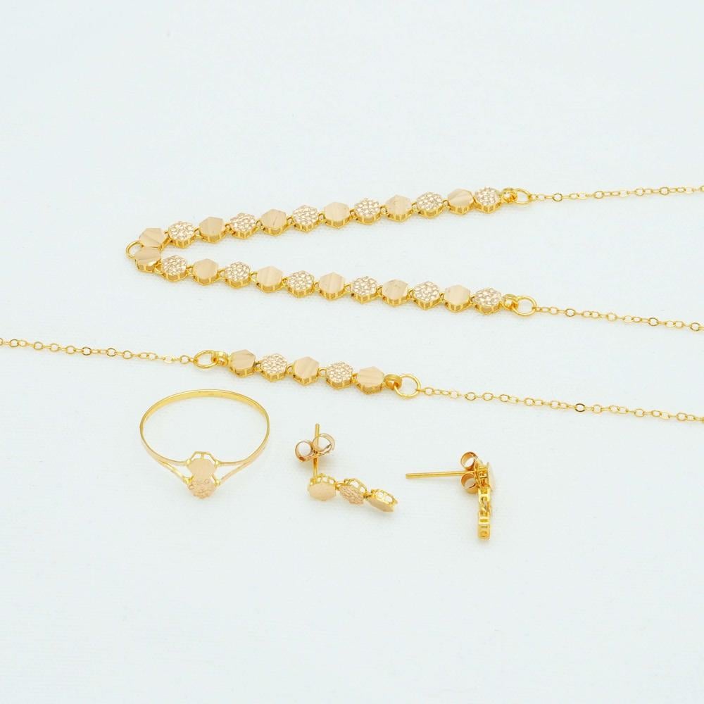 طقم ذهب فاخر، ومميز للغاية، مصنوع من الذهب الاصلي عيار 21، تفاصيله ساحرة، وراقية، وغير عادية، وكل نقشاته توحي لك بشيء واحد فقط وهو أنه طقم غير عادي وكل تفاصيله راقية.
