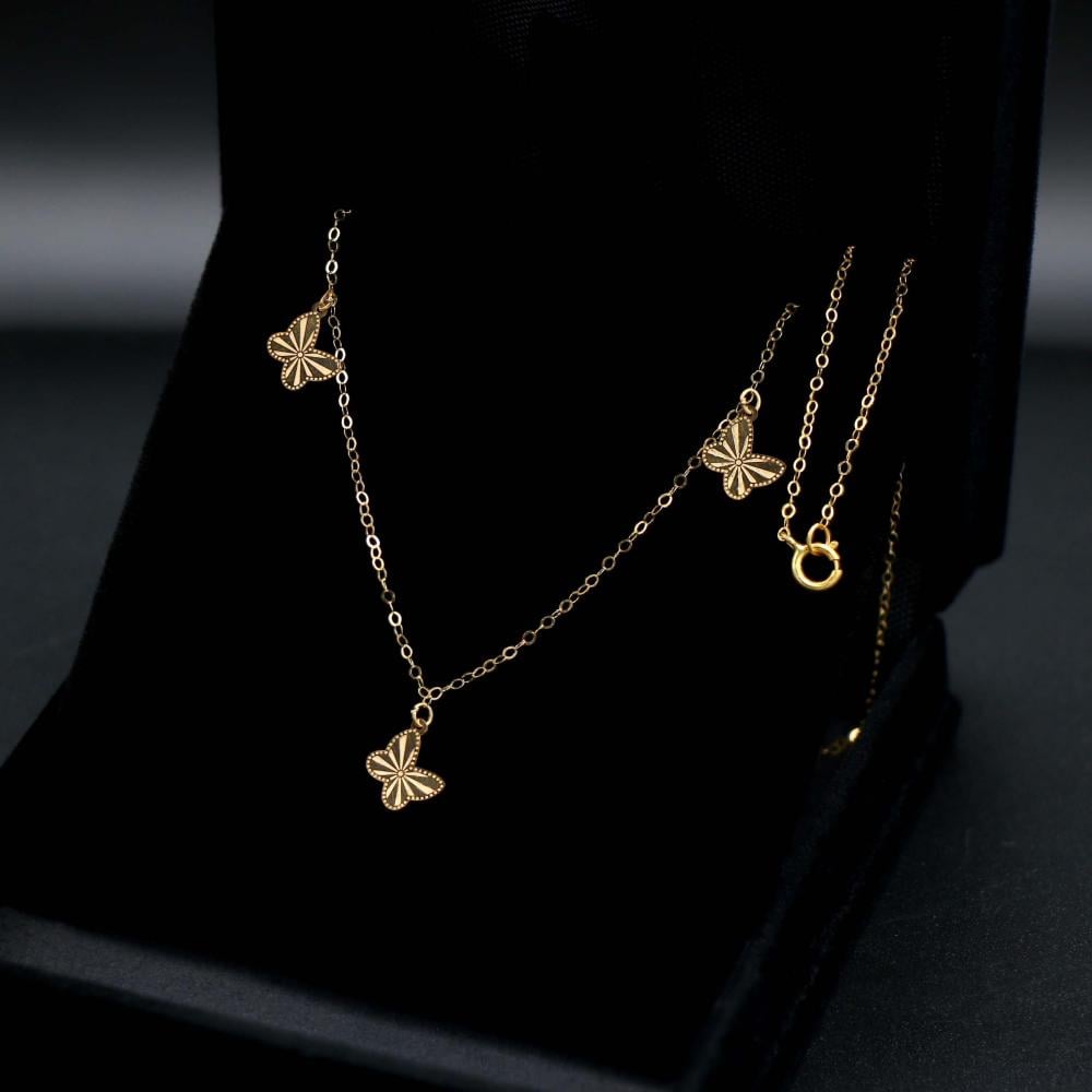 عقد ذهب فراشات ناعم للغاية ومميز، مصنوع من الذهب الأصلي الصافي، تصميمه في غاية الرقة، والنعومة، وشكله ملفت ويدعوك دومًا لأن تكوني رمز للتألق الذي لا ينتهي.