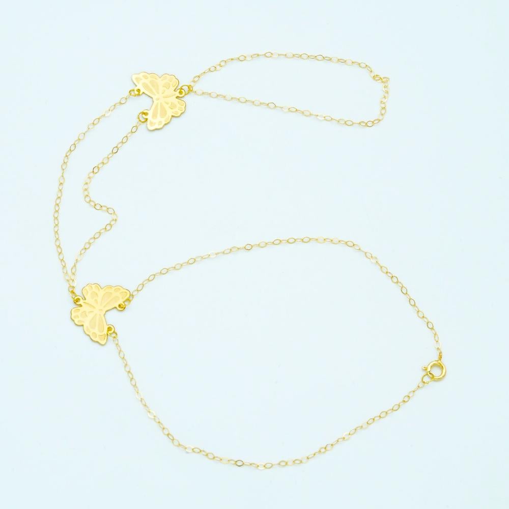 كف ذهب فراشات بتصميم أنثوي أنيق، يمتد بين أصابعك، ومعصم يدك بكل نعومة، وتألق، يمتد من السوار إلى الإصبع بسلسلتين ذهبيتين رفيعتين تتقابلان عند منتصف اليد، حيث تتوسطهما فراشتان بتفاصيل دقيقة تُحاكي الطبيعة بدقة وإبداع.