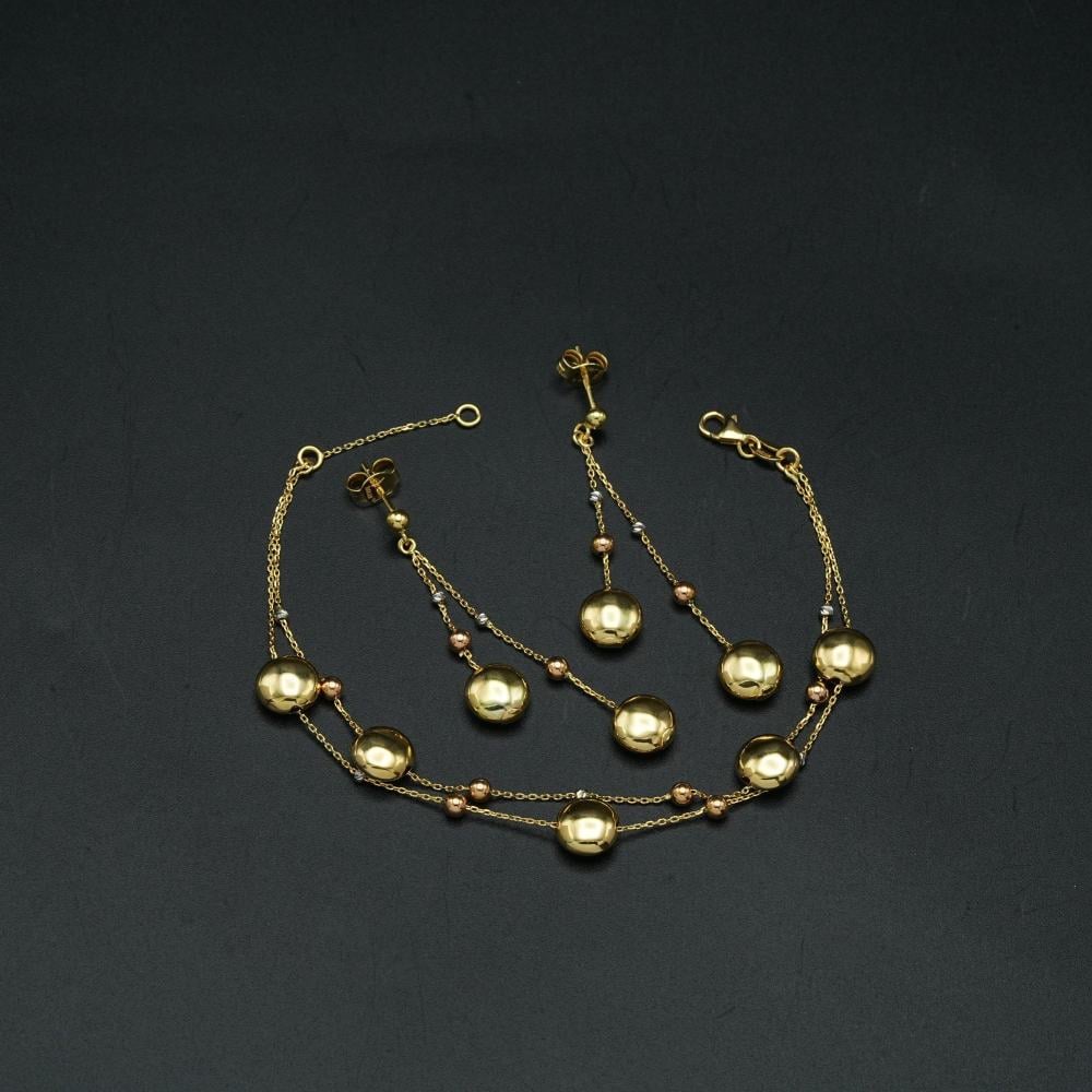 يتكوّن الطقم من عقد مزدوج الطبقات، مزين بكريات ذهبية لامعة موزعة بتناغم على سلاسل رفيعة، الحلق، السوارة، والخاتم يكملون المشهد بذات التوزيع الأنيق، ليصنعوا حضورًا ناعمًا ومترفًا في آنٍ واحد.