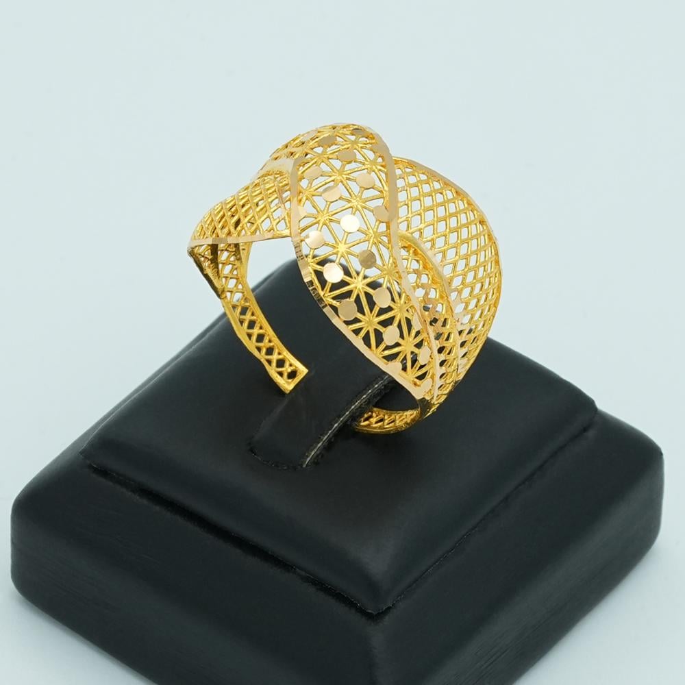 خاتم ذهب بتفاصيل متداخلة، وكأنها تنسج حكاية من الأناقة، والرقي، تصميمه ملفت للأنظار ويبرز على يدك بكل ثقة، ويمنحك لمسة راقية تلفت الأنظار نحوك، ويُكمل إطلالتك بكل ذوق ورقة، وأناقة.
