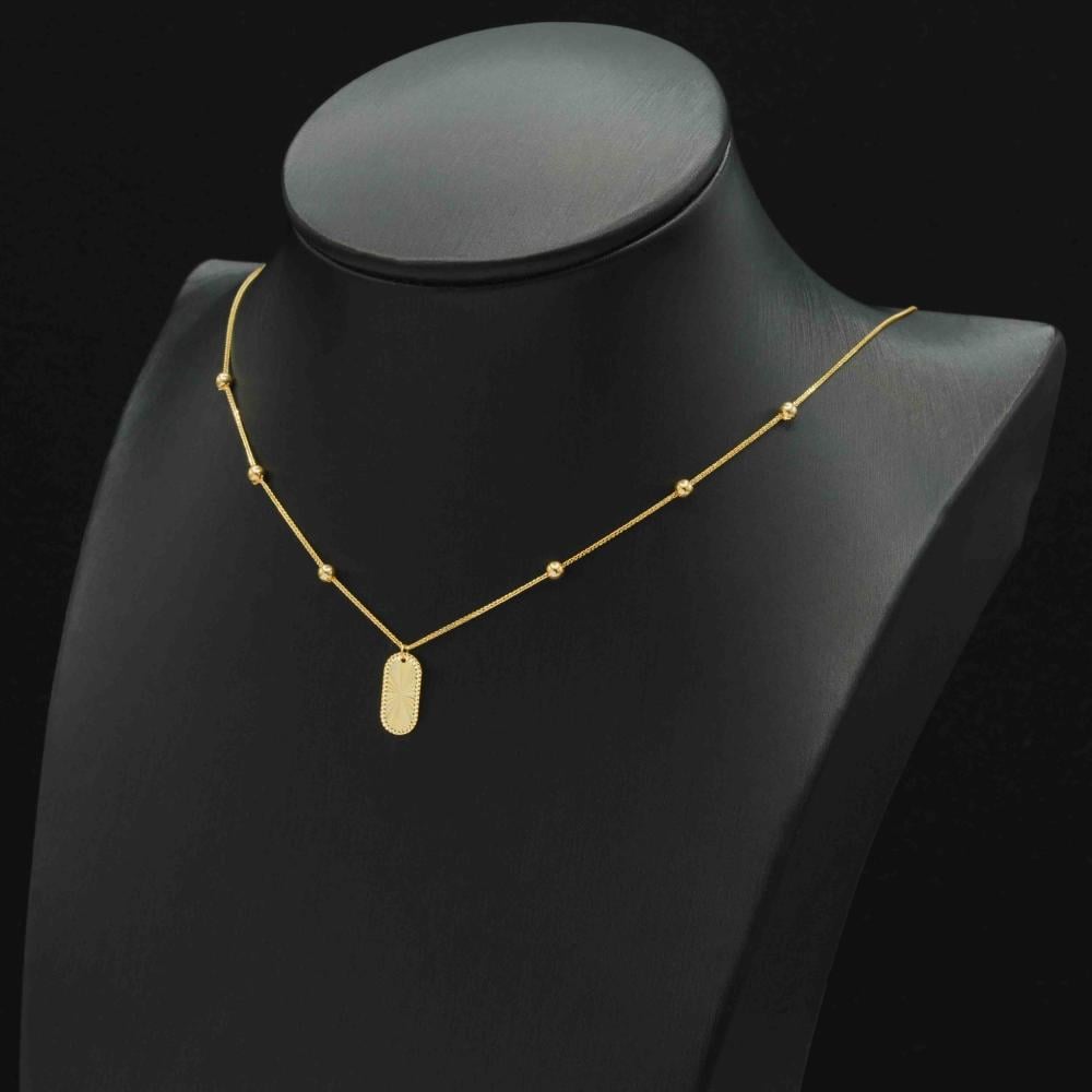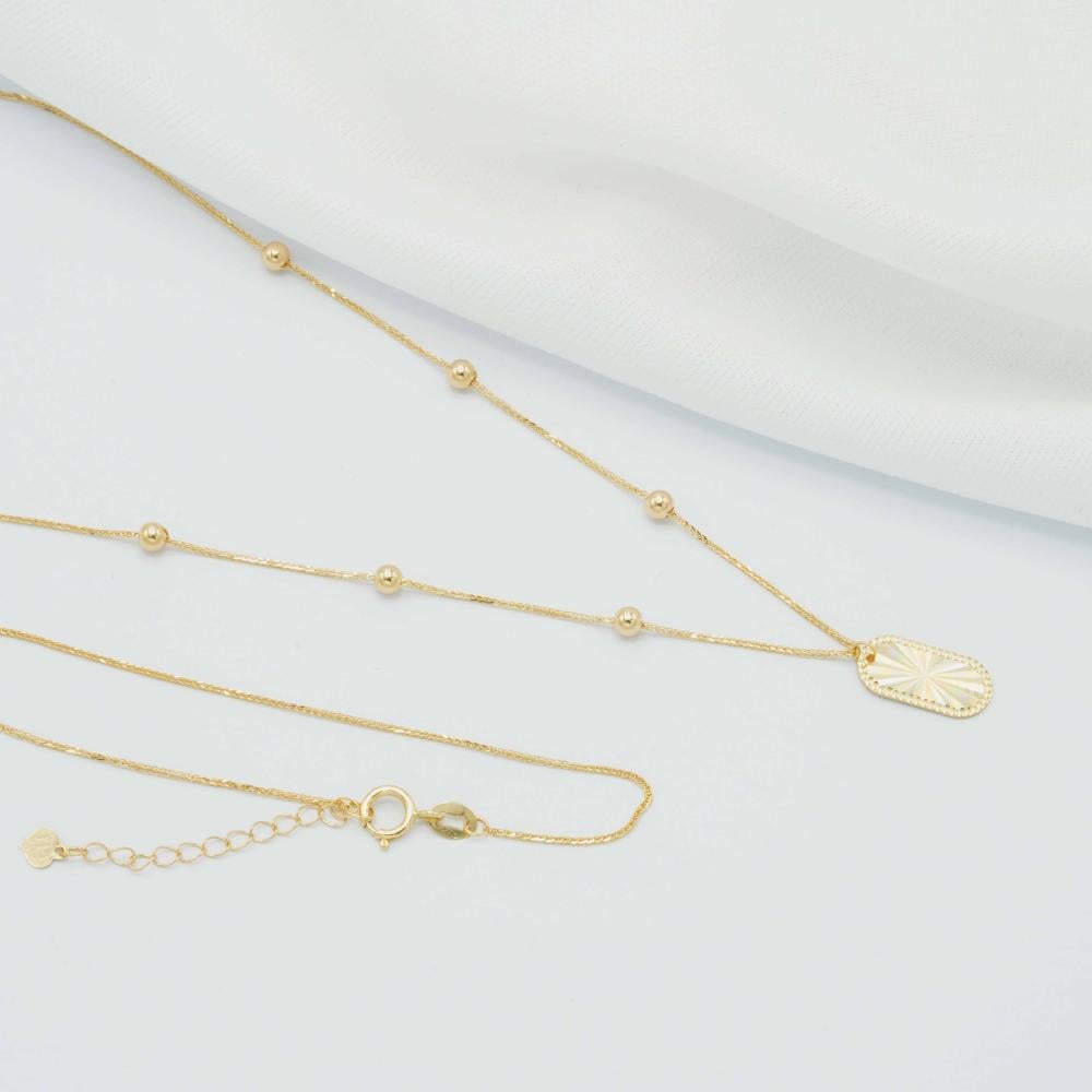 عقد ذهب أنيق كله تألق، وفخامة، وتفاصيل راقية، تتوزع الكرات الذهب الصغيرة على السلسلة بتناغم يضيف نعومة، وبريق مميز، أما التعليقة البيضاوية المنحوتة بخطوط متناثرة تمنح العقد لمسة إشراق تُكمل أناقتك بثقة، وأنوثة، أيضًا جمال العقد يجعله مناسب للإرتداء بكل الأوقات.