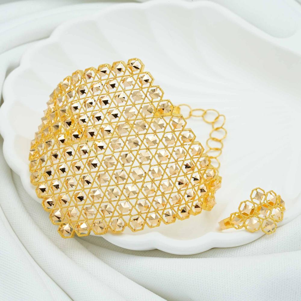 سوارة عريضة، وفاخرة، مع خاتم ذهب أنيق يتناغم معها، مصنوعة من الذهب عيار 21، الرتابة والتداخل بالزخارف يكسبها أناقة استثنائية غير عادية؛ لتكون إطلالتك أنيقة لا تُنسى في كل الأوقات، والمناسبات.✨