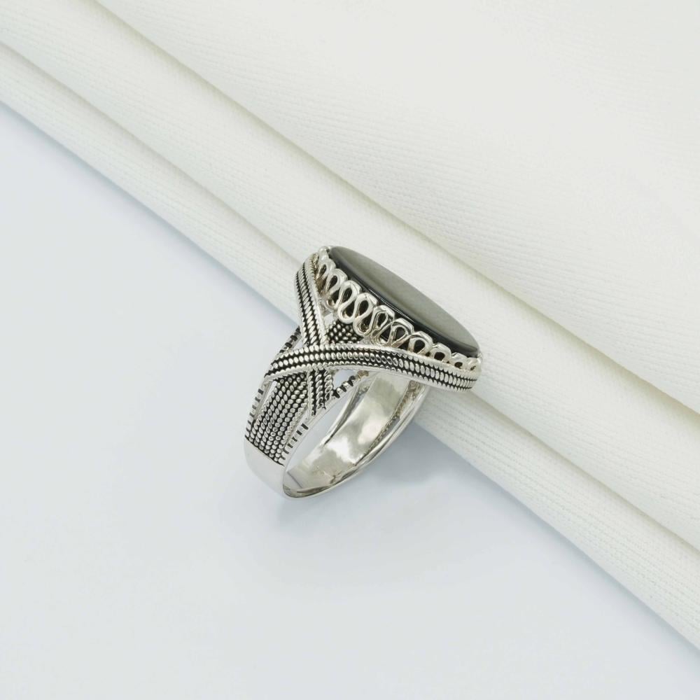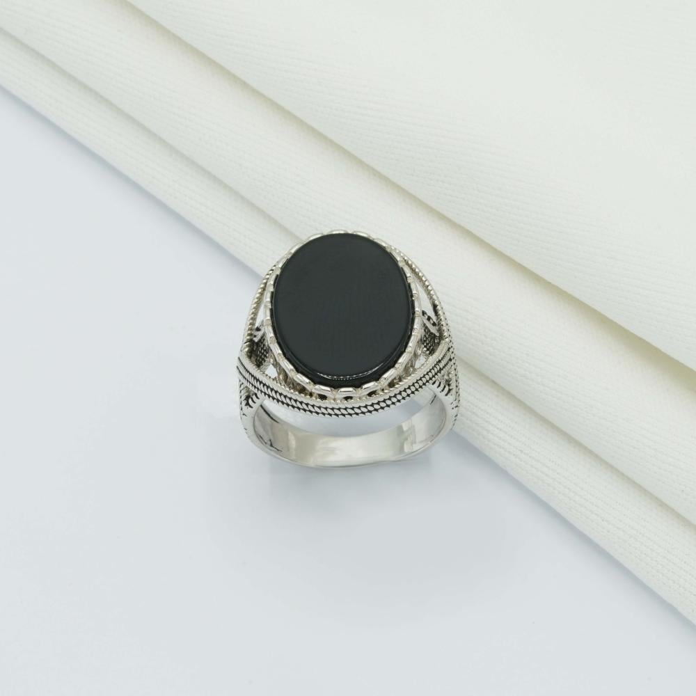 التناعم بين الحجر الأسود اللامع، والفضة، يضيف الكثير من الفخامة، والهيبة للخاتم، ويعتبر هذا الخاتم مبالغة مميزة بين الهيبة، والفخامة التي تناسب كل رجل يبحث عن الفخامة، والأناقة المميزة لإطلالته اليومية.