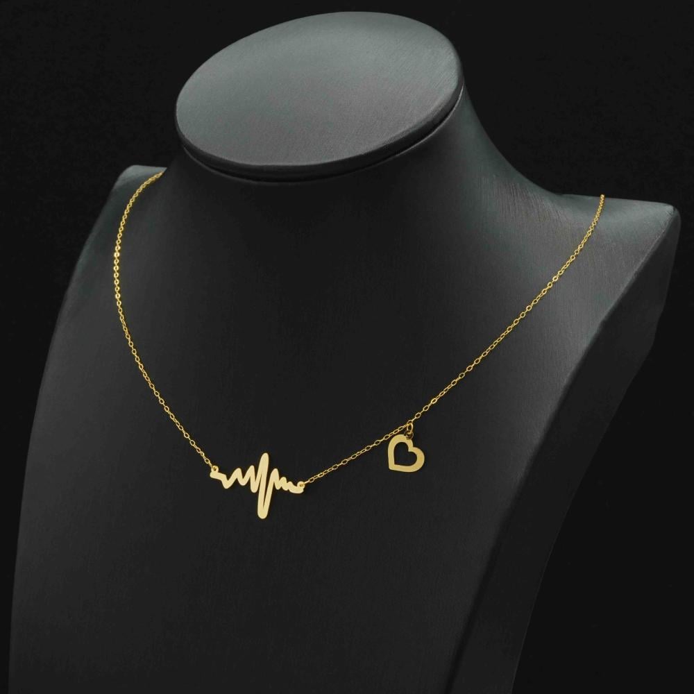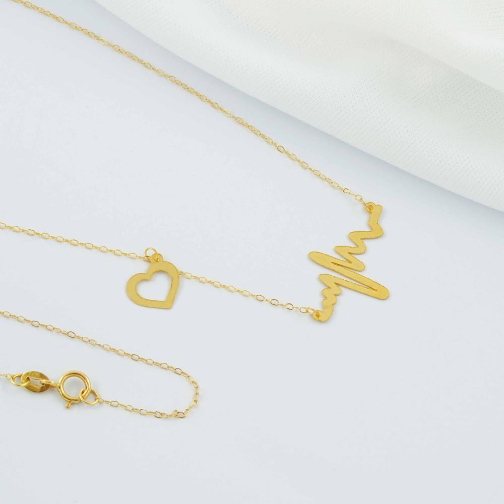 عقد ذهب خالص عيار 18، يأتي بتصميم عصري استثنائي قريب من القلب، ويجمع بين رمزية القلب والحب، والمشاعر، والنبض؛ ليحمل معنى الحب، والتجدد، والحياة في آن واحد، تتدلى منه أيقونة نبض القلب بخطوط انسيابية متقنة، ومتصلة بقلب صغير يعكس الحب، والعاطفة، والحنان.