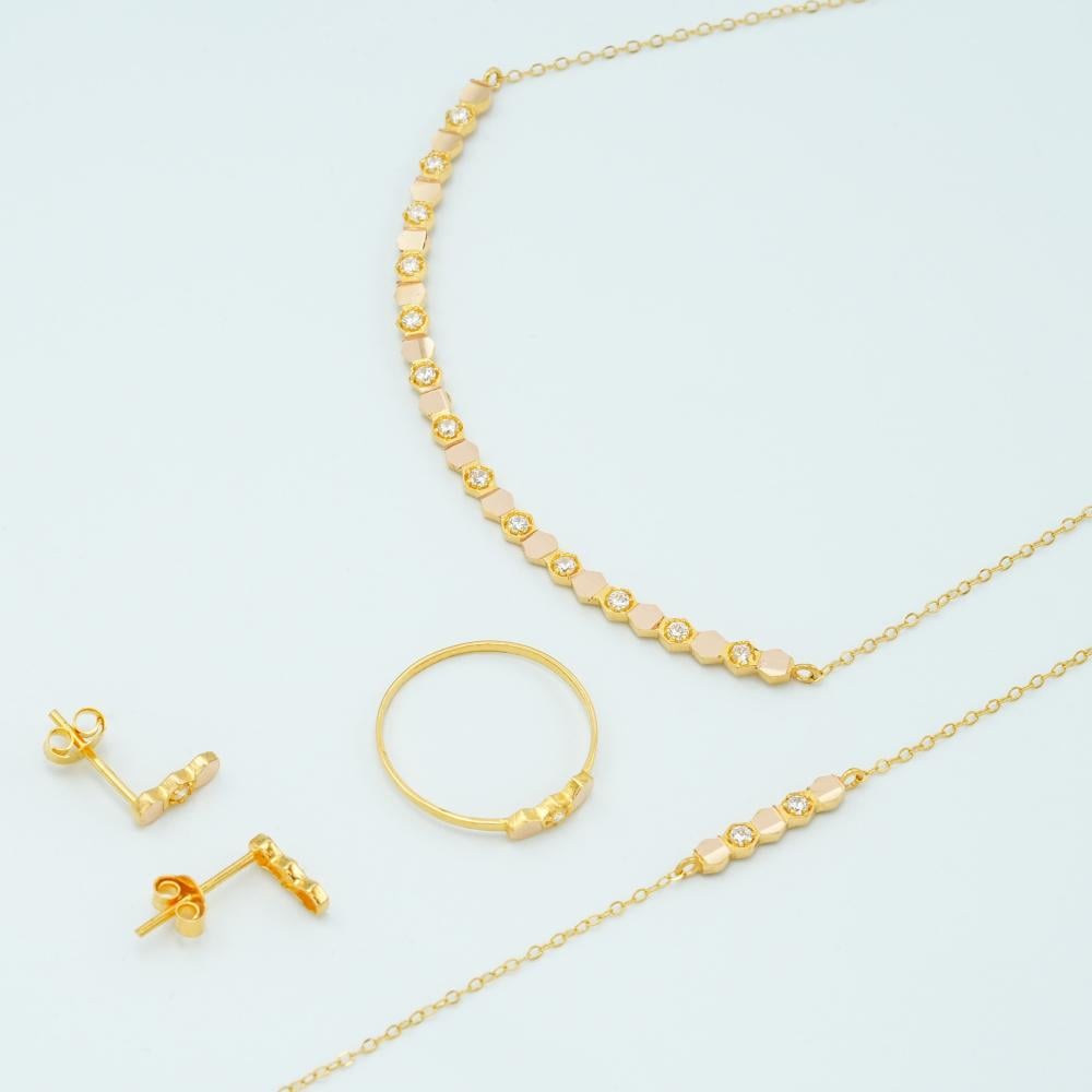طقم ذهب بلمعانه وكأنه خيوط شمس لامعة، تضئ بشكل غير عادي ومميز، ويلفت جميع الأنظار نحوك وبكل جاذبية، يتكون من سلسال يهمس برقته على عنقك، وسوارة تنساب كهمسة ناعمة على المعصم، وخاتم يحتضن اصبعك بنعومة، وحلق كإنه نجوم صغيرة لامعة تضئ إذنيك. 💛