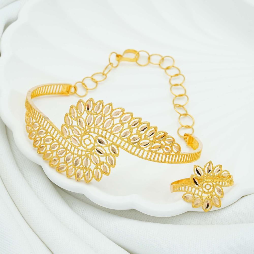 سوارة وخاتم بتصميم فاخر يشبه نبتة ذهبية تتفتح على معصمك بكل نعومة وأناقة✨، تفاصيل أنيقة من الذهب الخالص عيار 21، تتداخل فيها الزخارف بشكل أنيق يخطف الإنتباه من أول نظرة لها. 💛