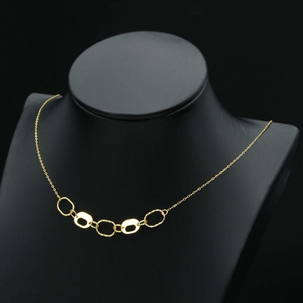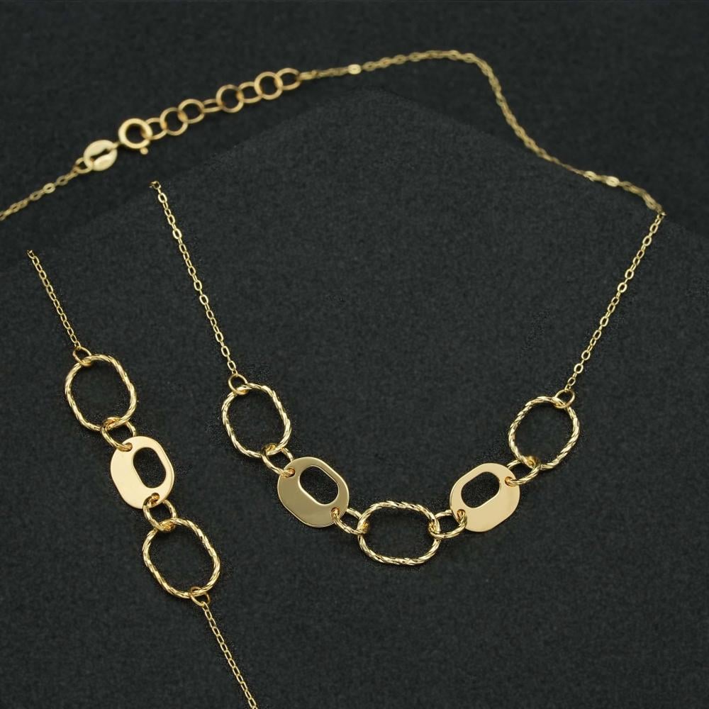عقد وسوارة ذهب عيار 18، يكمن جمالهما بالحلقات المتصلة معًا، الجاذبية التي تكمن من تناغم تصميم العقد والسوارة غير عادية، وكوني على ثقة بأنها تهمس لكِ بأنك غير عادية، ولا يليق بكِ إلا ما هو متألق.