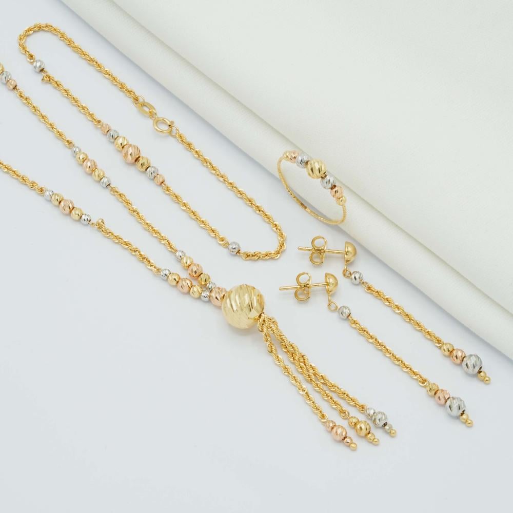 طقم ذهب فاخر بتصميم راقِ يجمع بين الانسيابية، والنعومة، العقد تتوسطه كرة ذهب أنيقة تتدلى منها خيوط ذهب تضيف لمسة فخمة لحضورك، مع سلسلة بتفاصيل أنيقة من الذهب الأبيض، والأصفر، تمنحه بريق متناسق مع الحلق، والخاتم، والسوارة الأنيقة؛ لتعبر عن أنوثة راقية، وحضور ساحر.