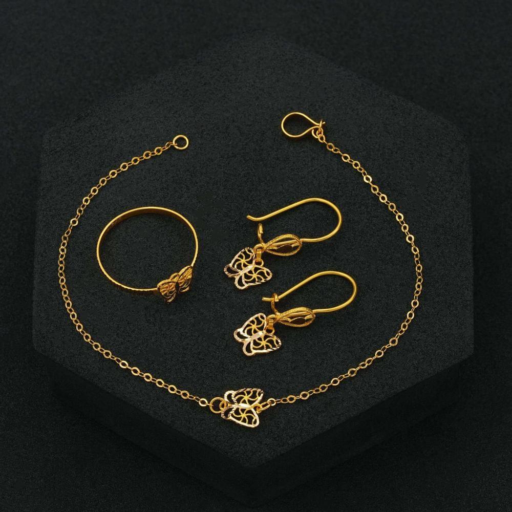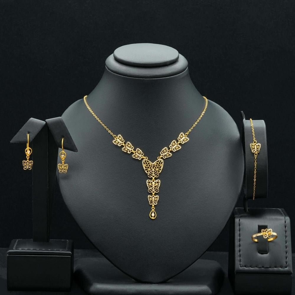 طقم ذهب أنيق عيار 21، بشكل مميز وأنيق، وغير عادي، كل تفاصيلها توحي بالفخامة، وجمال الطقم يلفت الأنظار نحوك بجاذبية لا مثيل لها، ويخبر الجميع بأنك الأجمل دومًا بإختياراتك.
