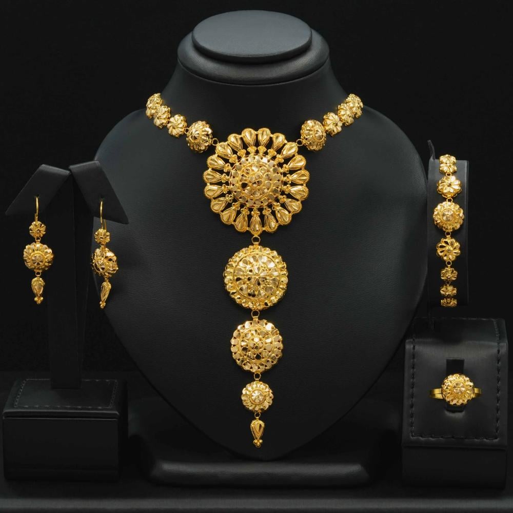 لا شيء يشبه جمال، وفخامة طقم كرسي جابر الفخم هذا، والمصنوع من الذهب الخالص عيار 21، كل تفاصيله فخمة، وفاخرة، وراقية، ومميزة من العقد الذي يتكون من سلسلة بزخارف راقية، إلى التعليقة التي تتدرج بها الزخارف برقة لا مثيل لها، مع تناغم بالشكل بينه وبين الحلق، والخاتم، والسوارة.
