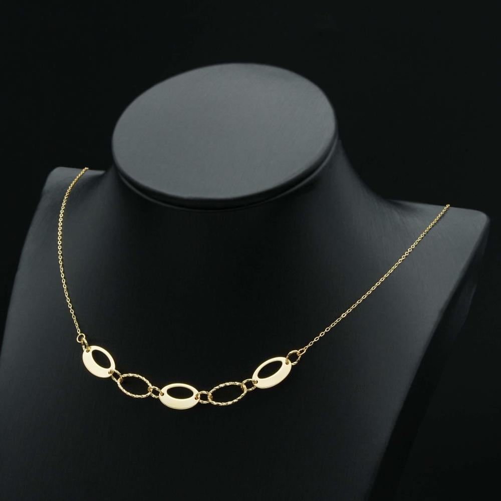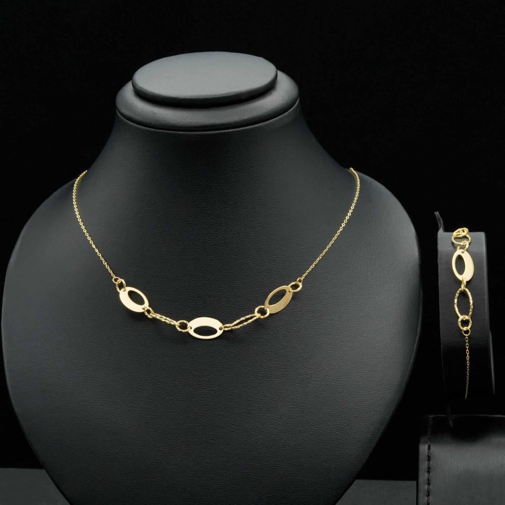 عقد وسوارة ذهب، تتقاطع فيها الدوائر مع بعضها البعض بكل منهما لتشكل تناغم مرتبط بنعومة، وعذوبة لا مثيل، ولمعان الذهب وارتباطه يشكل جاذبية لا تقاوم.