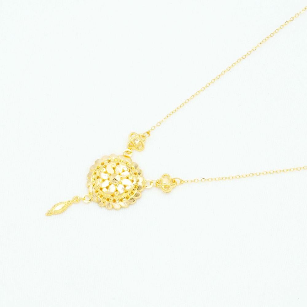 عقد ذهب كرسي جابر ينطق بالفخامة، ويتحدث برواية متكاملة للجمال، والتألق الذي لا ينتهي، مصنوع من الذهب الأصلي عيار 21، السلسلة كأنها خيوط ذهب تمتد ثم تلتقي في المنتصف لتحتضن العنصر المركزي البارز، الوحدة الدائرية المميزة بتفاصيلها المميزة والمزخرفة داخل إطار مزركش.