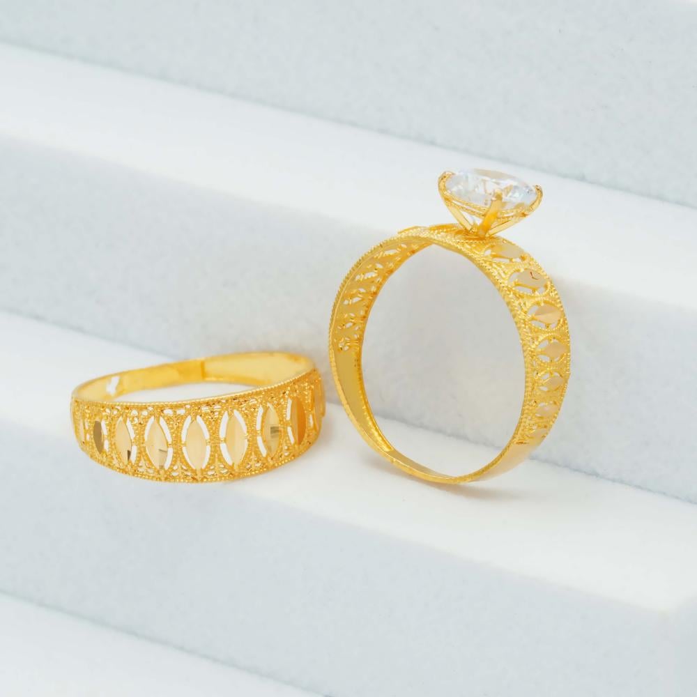 خاتم توينز ذهب عيار 21 بتصميم استثنائي يدمج بين اللمسة العصرية والفخامة الكلاسيكية، مرصع بحجر لامع مميز يلفت الأنظار ويمنحك إطلالة فخمة تخطف القلوب والأنظار في حفلة خطوبتك، أو زواجك ، ويحعلك تتألقين بأكثر لحظات حياتك تميز. 💍