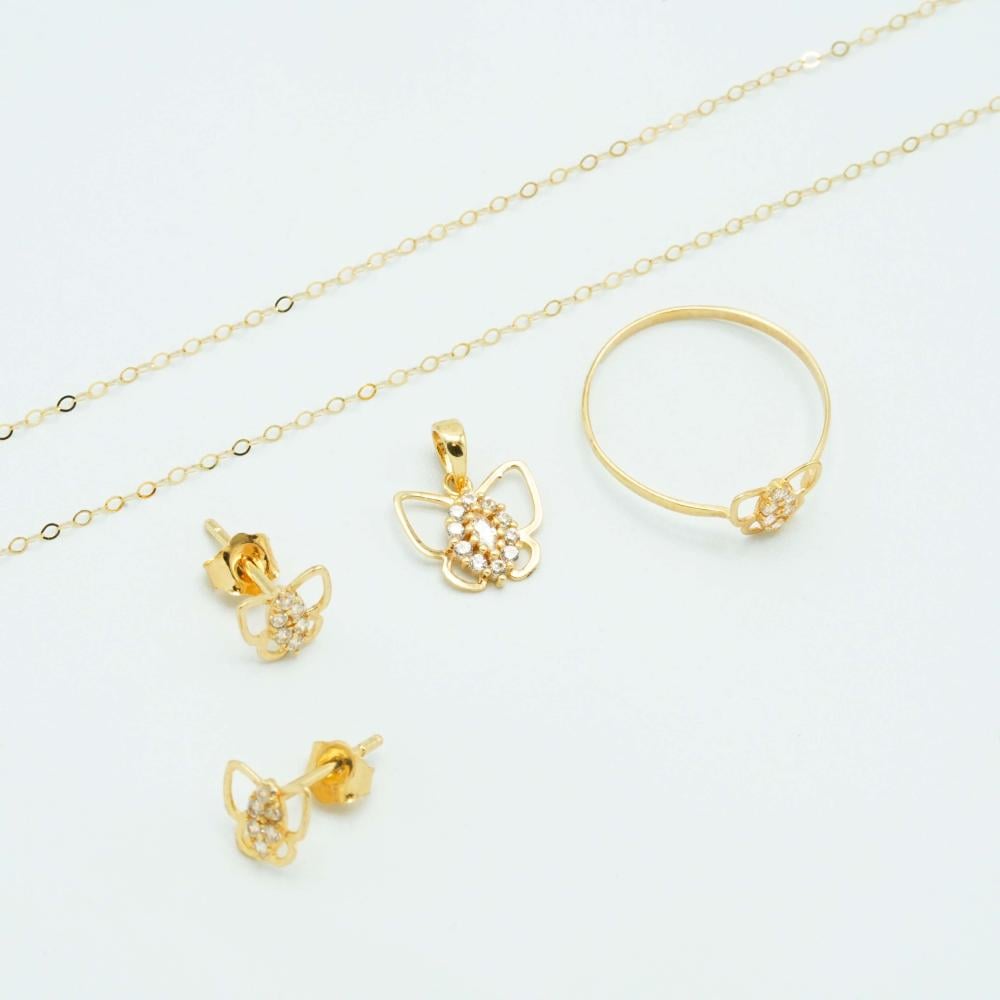 نصف طقم ذهب فراشات للأطفال، مصنوع من الذهب الخالص عيار 18، تفاصيل الأنوثة والبراءة تحاوطه مكون من عقد ناعم يتناغم شكله مع الخاتم، والحلق لتكون مناسبة لهدية ابنتك الأولى منك. 👧