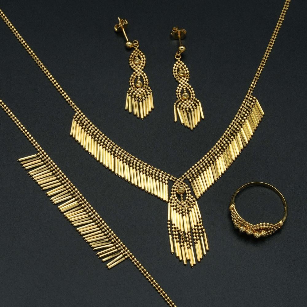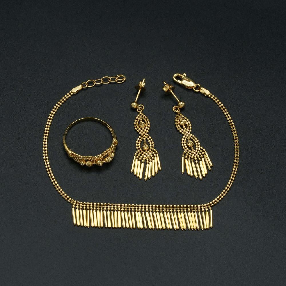 A distinctive, soft, and shiny gold set that combines modern design and unparalleled elegance. Every detail in it exudes beauty and distinctive, refined taste. You will definitely like it if you are skilled at elegance and distinction.