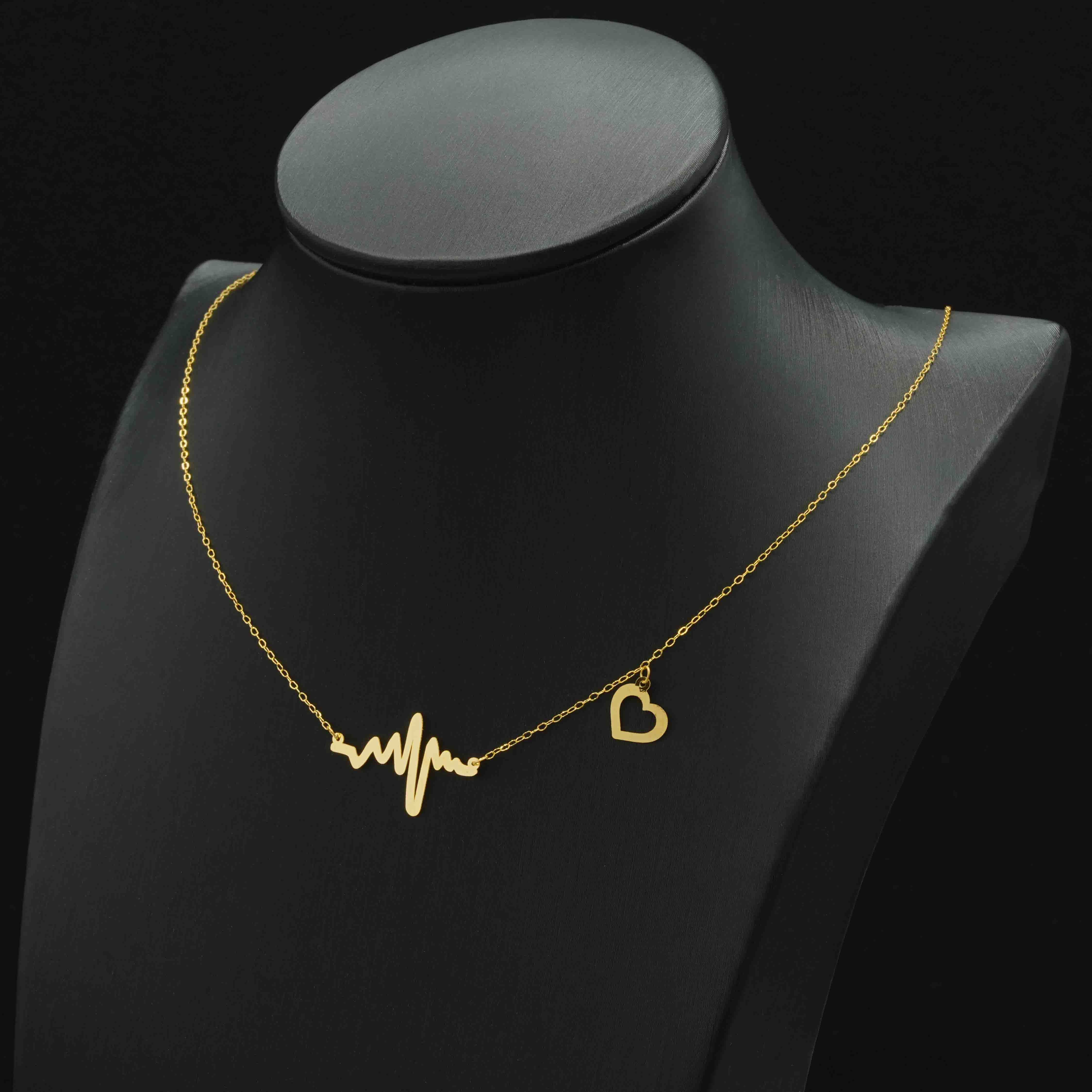 عقد ذهب خالص عيار 18، يأتي بتصميم عصري استثنائي قريب من القلب، ويجمع بين رمزية القلب والحب، والمشاعر، والنبض؛ ليحمل معنى الحب، والتجدد، والحياة في آن واحد، تتدلى منه أيقونة نبض القلب بخطوط انسيابية متقنة، ومتصلة بقلب صغير يعكس الحب، والعاطفة>