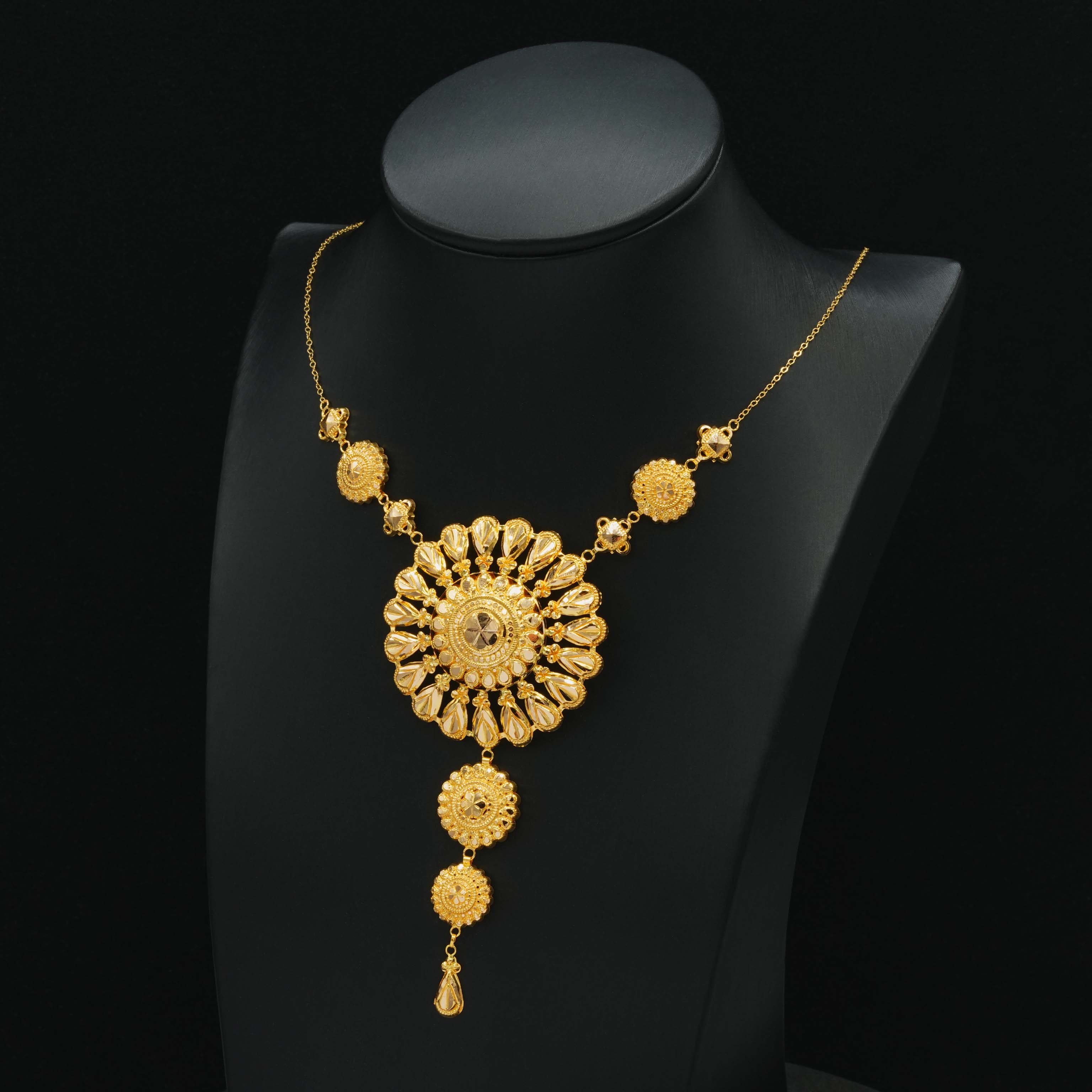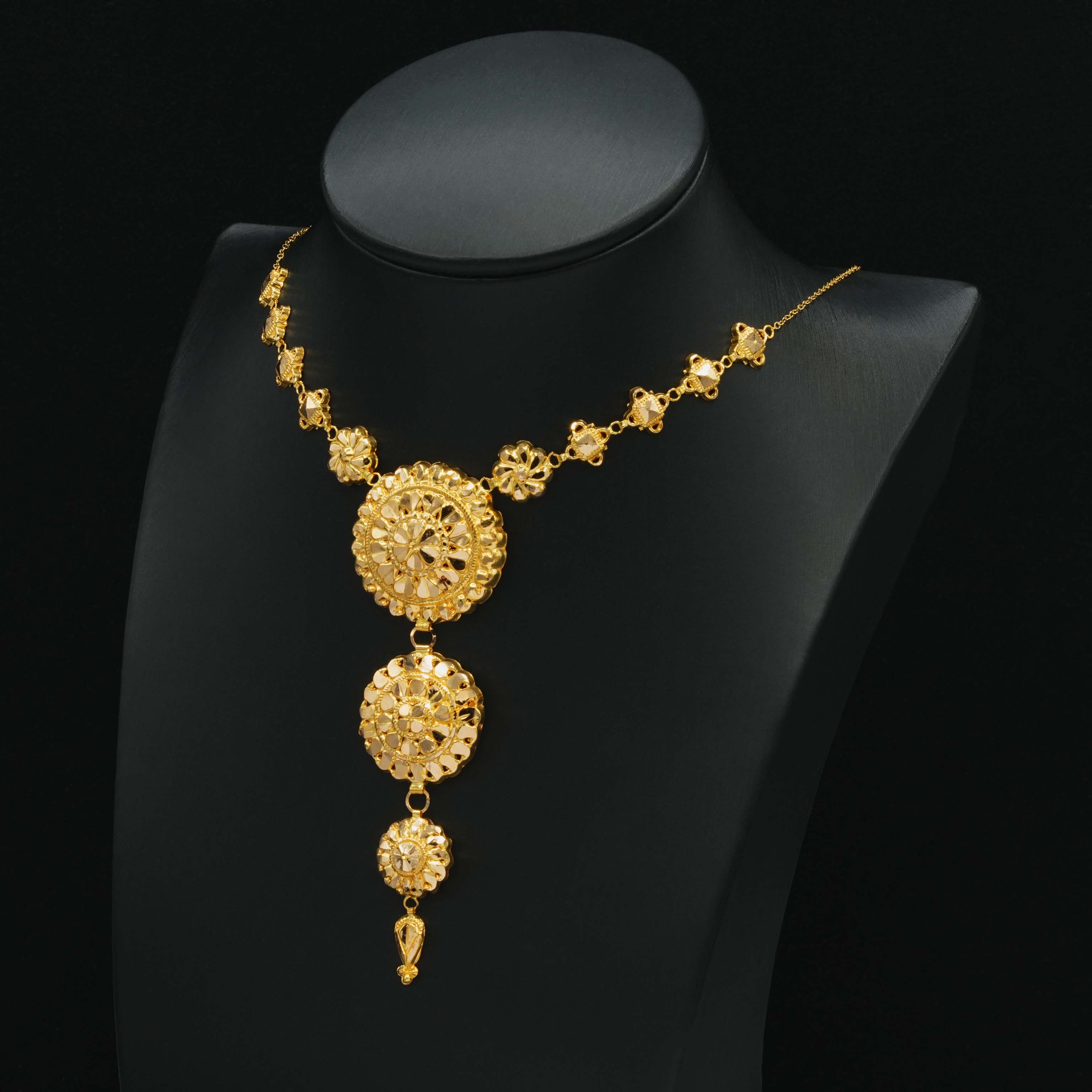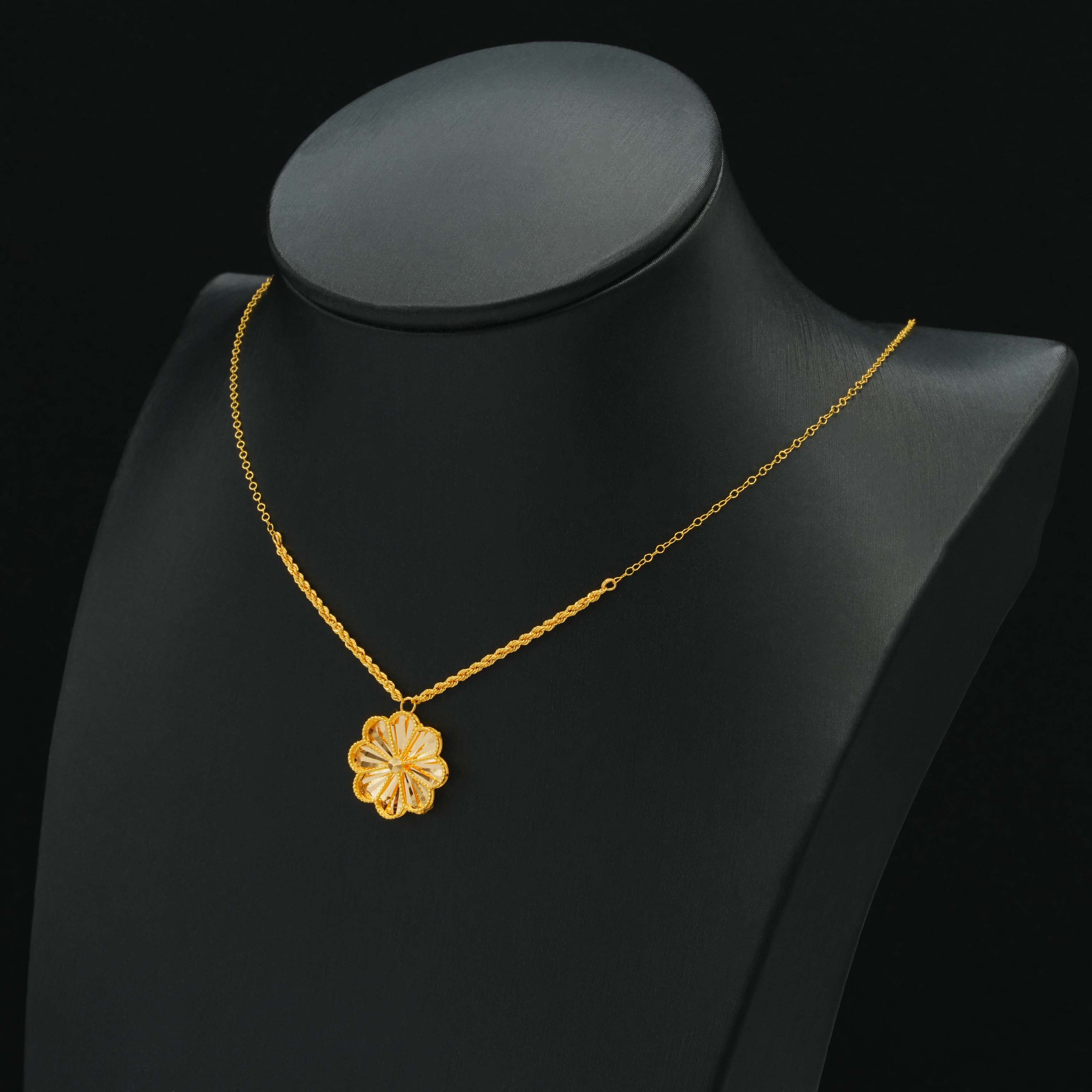عقد ذهب الزهرة المتفتحة بتصميم أنيق، مصنوع من الذهب الخالص عيار 21، هذا العقد بتصميم متألق وغير عادي تشعري وكأنه تدرج أناقة.