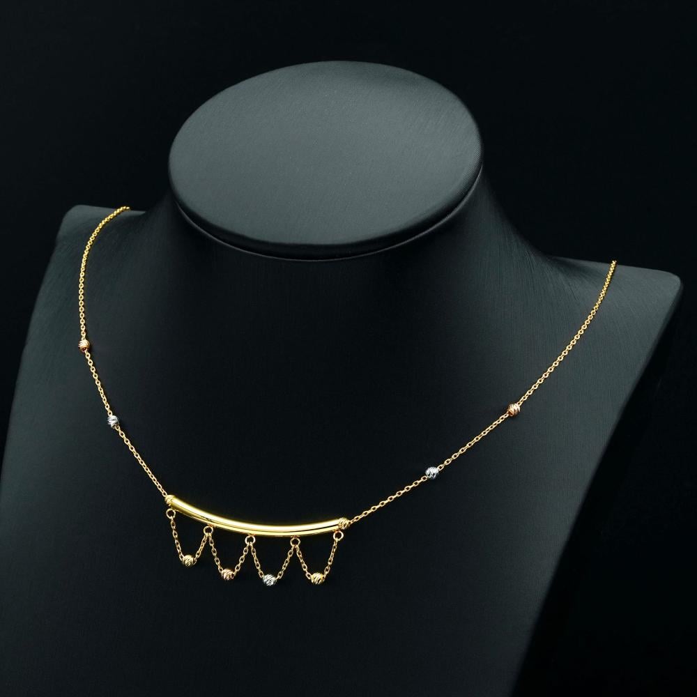 The necklace features an elegant design that combines soft lines and delicate decorations. The central part of the necklace stands out with an elegant golden ribbon that extends horizontally, from which hang beautiful, sparkling decorations that reflect the light in a charming way.