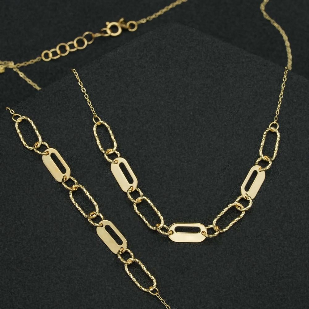 يكمن جمال السوارة والعقد بتناعم التصميم، وأيضًا بالحلقات المتصلة بترابط أنيق، ومميز، ولإنك بارعة الجاذبية هذا التناغم الغير عادي يليق بكِ، وبكِ وحدك.