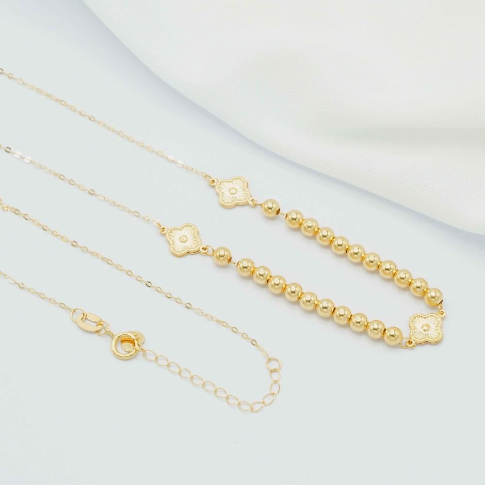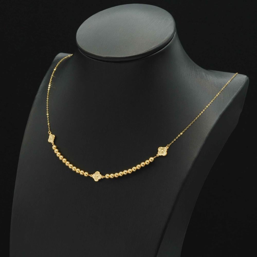 عقد ذهب ايطالي ناعم عيار 18، تصميمه متوازن، ومتناغم، ويخطف الأنظار، ويتكون من كرات ذهب مصقولة بكل تألق، وتتوسطه زخارف على شكل زهور مميزة تمنحه لمسة أنوثة ناعمة، ومتألقة، مع تفاصيل مميزة، ولمعان ملفت، وكل هذا يجعله عقد يحاوط عنقك ويعتبر مثالي لجميع إطلالاتك.