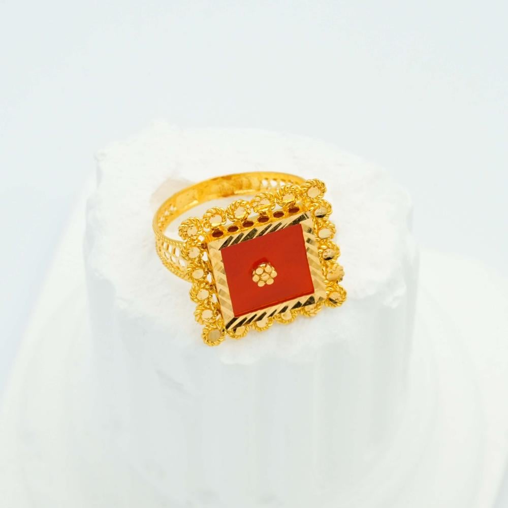 خاتم شرقي بتفاصيل مختلفة، الإطار الذهب خاتم شرقي آسر بتفاصيله غير العادية؛ إطار ذهبي مُزخرف بشكل مربع وبداخله لون أحمر عميق ومميز، لمعانه أنيق، وتصميمه جرئ، ويعتبر خيار مثالي لمن تبحث عن الأشياء الغير عادية.✨