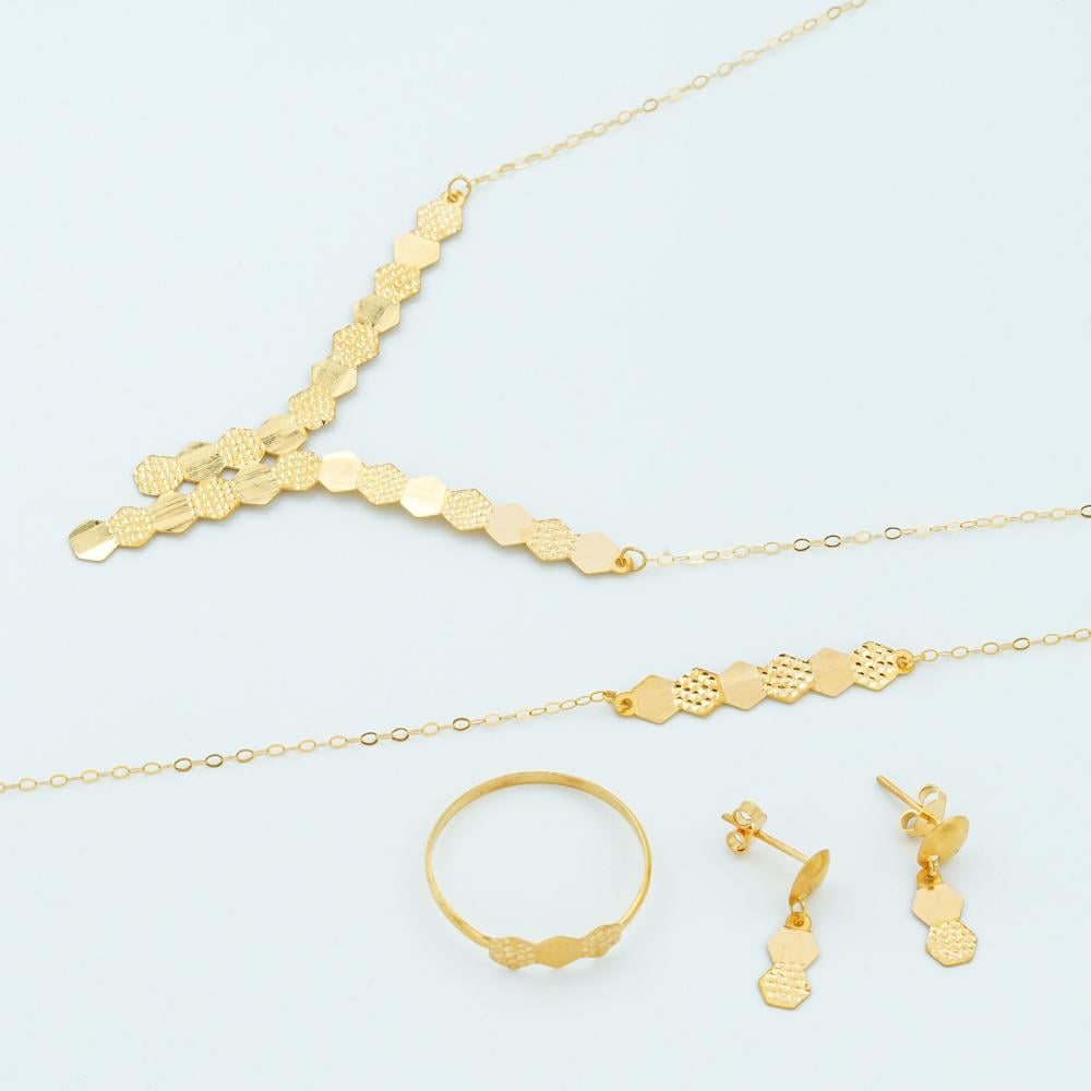 طقم ذهب يتدلى بكل أناقة، تتدرج فيه تفاصيل الجمال وتتالى بشكل أنيق، يجمع بين النعومة، والتميز في كل تفاصيله، ليمنحك حضورًا متكاملاً يعبّر عن ذوق رفيع وشخصية تعرف كيف تختار. ✨